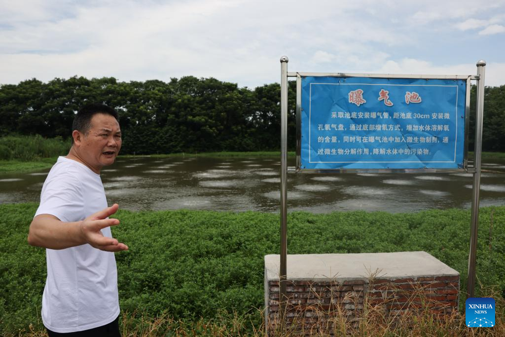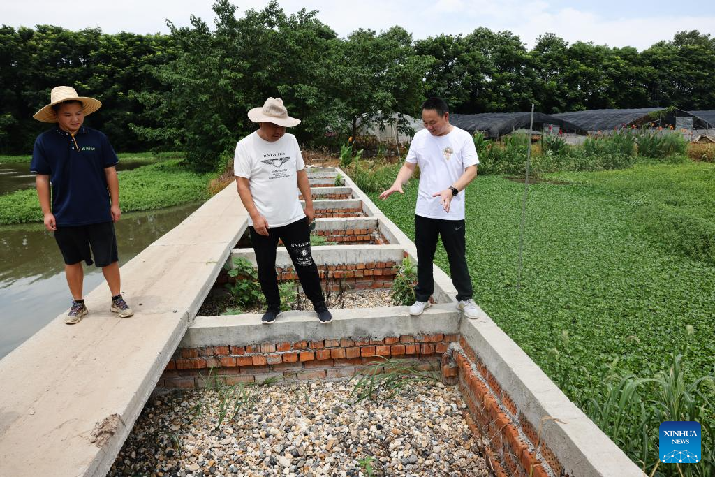 Xie Yonghong introduces a self-designed breeding tailwater treatment facility at a bullfrog breeding base in Heba Town, Datong Lake District of Yiyang, central China's Hunan Province, July 10, 2023. Located on the central region of the Dongting Lake, Datong Lake is known as "the heart of the Dongting Lake". (Xinhua/Jin Liwang)