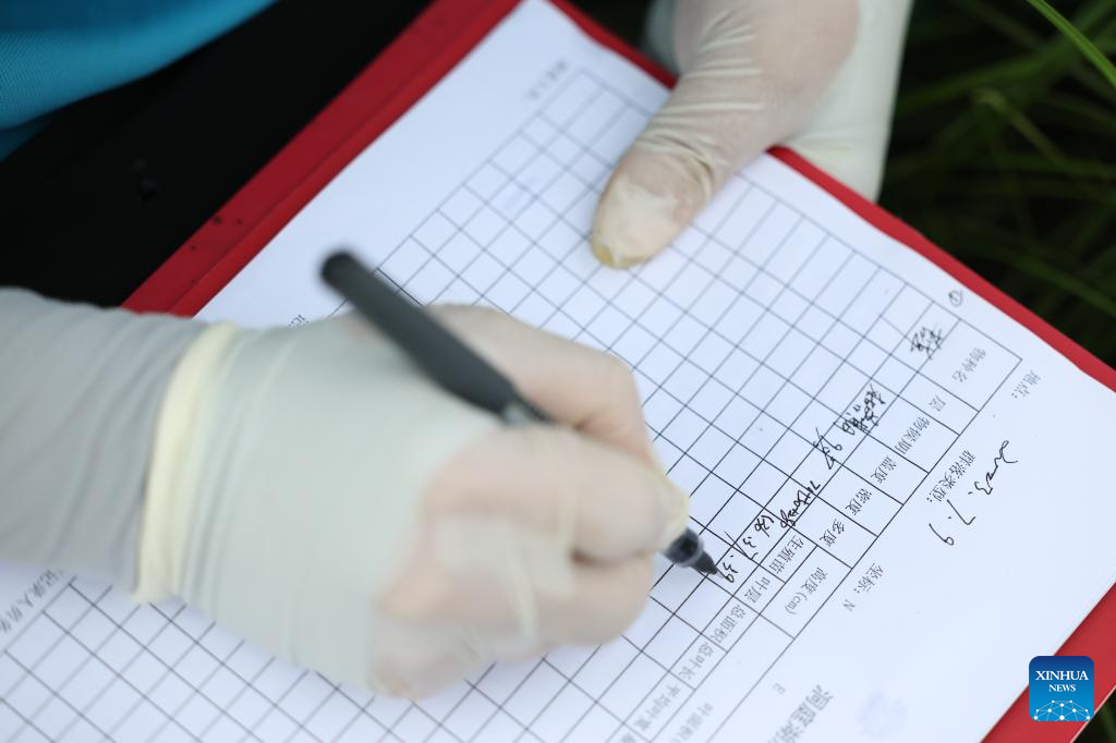 A member of the Dongting Lake Station for Wetland Ecosystem Research under the CAS records the condition of sedge samples in the east Dongting Lake nature reserve, central China's Hunan Province, July 9, 2023. (Xinhua/Xue Yuge)