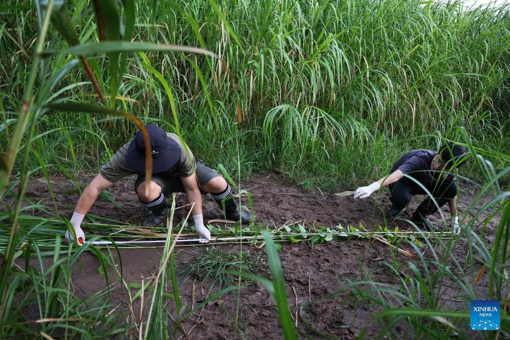 Members of the Dongting Lake Station for Wetland Ecosystem Research under the CAS prepare plant samples in the east Dongting Lake nature reserve, central China's Hunan Province, July 9, 2023. (Xinhua/Xue Yuge)