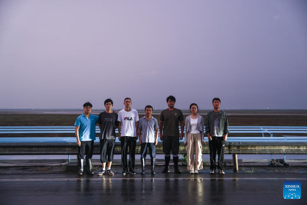 Members of the Dongting Lake Station for Wetland Ecosystem Research under the CAS pose for a photo after collecting samples in the east Dongting Lake nature reserve, central China's Hunan Province, July 9, 2023. (Xinhua/Jin Liwang)