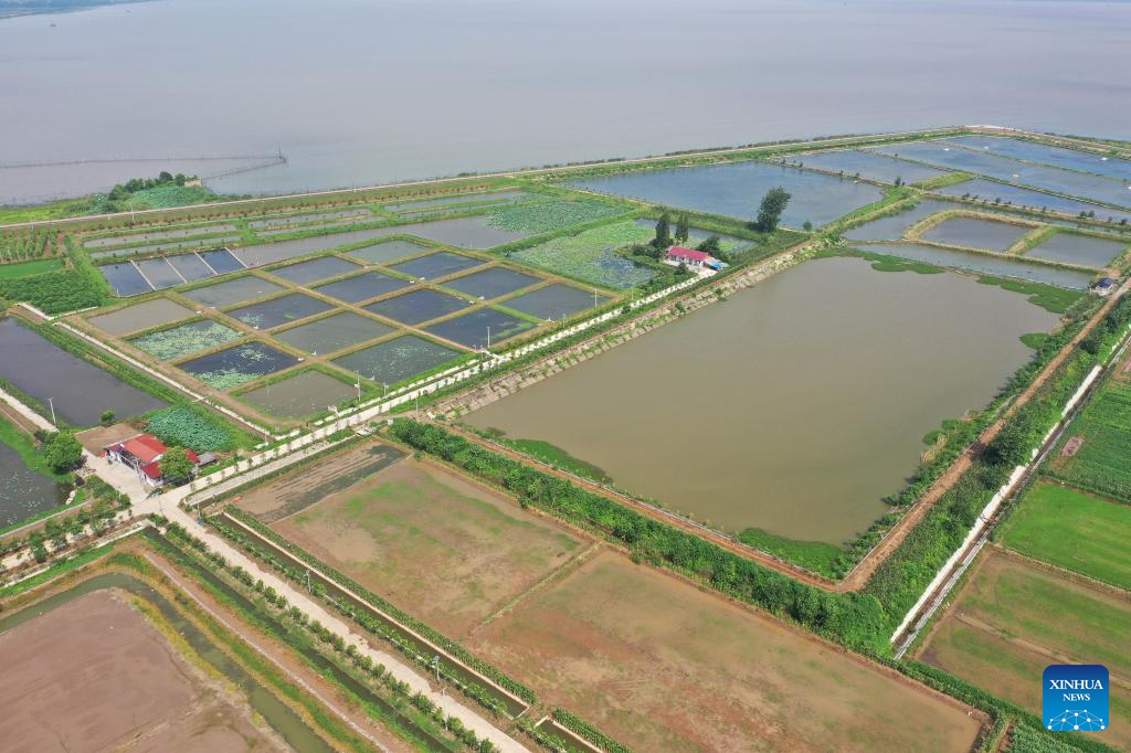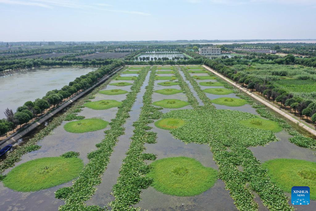 This aerial photo taken on July 10, 2023 shows the Datong Lake aquatic plants industrial demonstration park in Datong Lake District of Yiyang, central China's Hunan Province. Located on the central region of the Dongting Lake, Datong Lake is known as "the heart of the Dongting Lake". (Xinhua/Xue Yuge)