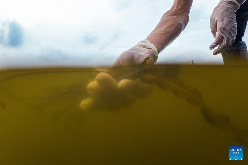 Doctor Chao Chuanxin, a member of the Dongting Lake Station for Wetland Ecosystem Research under the CAS, checks the condition of submerged plants in the east Dongting Lake nature reserve, central China's Hunan Province, July 9, 2023. (Xinhua/Zhou Dixiao)