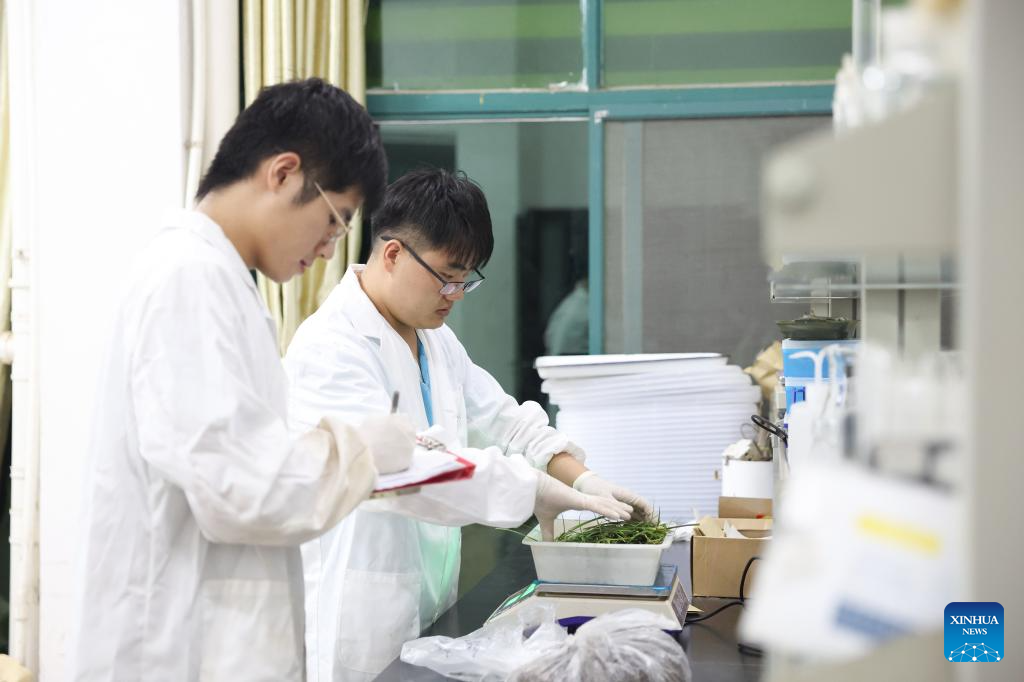 Researchers measure weight of sedge samples at the Dongting Lake Station for Wetland Ecosystem Research under the CAS in Yueyang, central China's Hunan Province, July 9, 2023. (Xinhua/Xue Yuge)