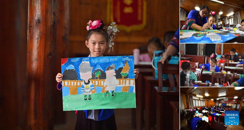This combo photo shows primary school student Yang Lina, 8, posing for a photo (L) and Yang learning farming-themed painting of the Dong ethnic group during a training course (R) in Sanjiang Dong Autonomous County, south China's Guangxi Zhuang Autonomous Region, July 13, 2023.?(Xinhua/Huang Xiaobang)