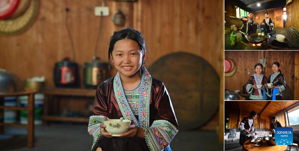This combo photo shows primary school student Wei Xuefei, 11, posing for a photo (L) and Wei learning making oleic tea from her mother (R) in Yaogao Village, Gandong Township of Rongshui Miao Autonomous County, south China's Guangxi Zhuang Autonomous Region, July 6, 2023.?(Xinhua/Huang Xiaobang)