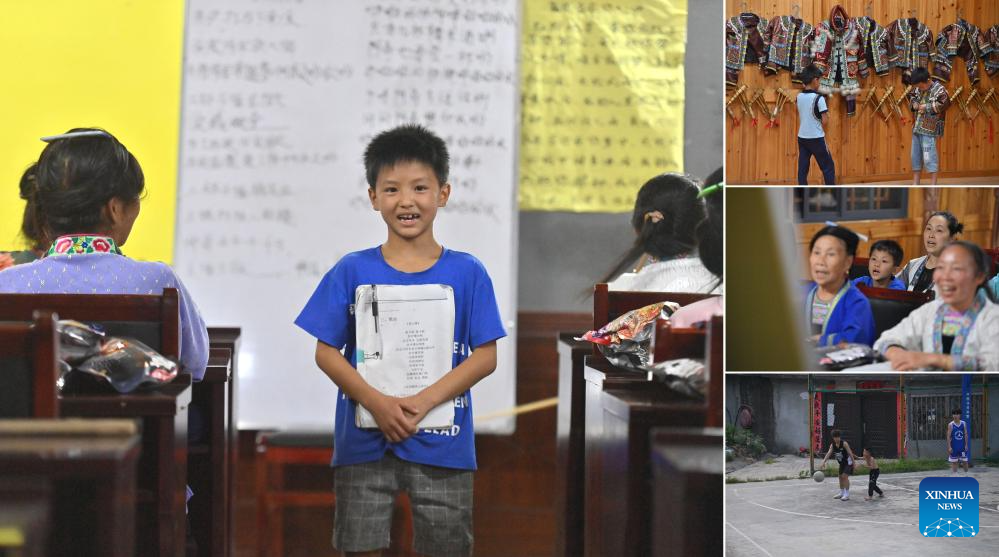 This combo photo shows primary school student Wu Liangyou, 8, posing for a photo on July 6, 2023 (L); Wu waiting to wear traditional attire before a folk custom activity on July 6, 2023 (R, top); Wu learning folk song of the Miao ethnic group on July 5, 2023 (R, middle); and Wu playing basketball with his brother on July 15, 2023 (R, bottom) in Dangjiu Village of Rongshui Miao Autonomous County, south China's Guangxi Zhuang Autonomous Region.?(Xinhua/Huang Xiaobang)
