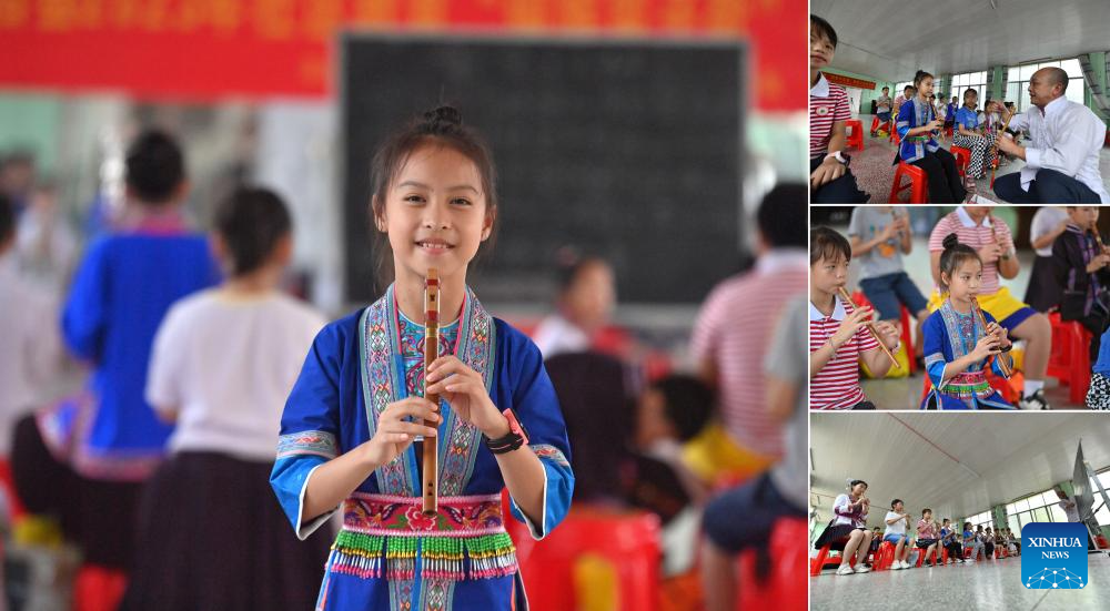 This combo photo shows primary school student Shi Jinjing, 10, posing for a photo (L) and Shi learning playing flute of the Dong ethnic group during a training course (R) in Sanjiang Dong Autonomous County, south China's Guangxi Zhuang Autonomous Region, July 13, 2023. (Xinhua/Huang Xiaobang)