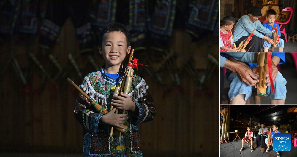 This combo photo shows primary school student Liang Wenxiong, 9, posing for a photo on July 5, 2023 (L) and Liang learning performing Lusheng, a traditional reed-pipe wind instrument, from his grandfather on July 6, 2023 (R) in Dangjiu Village, Gandong Township of Rongshui Miao Autonomous County, south China's Guangxi Zhuang Autonomous Region.?(Xinhua/Huang Xiaobang)