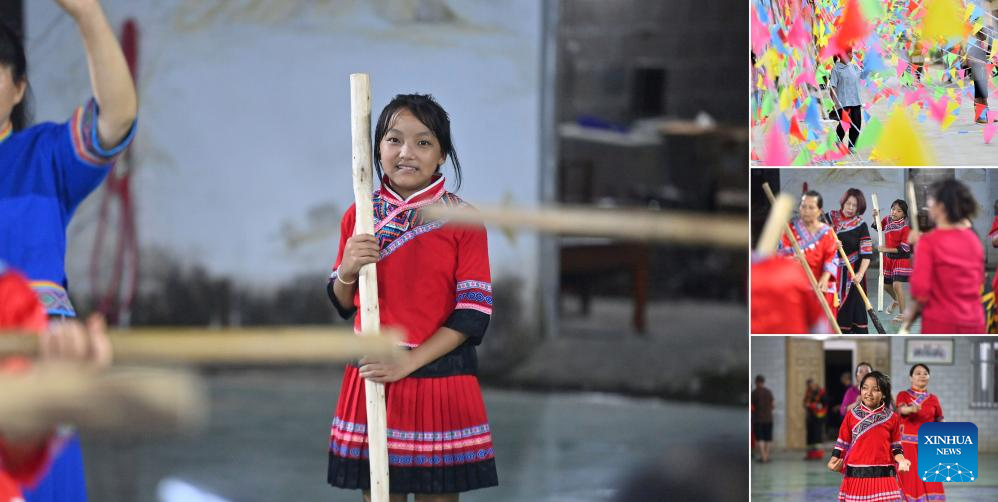 This combo photo shows primary school student Wei Huiman, 11, posing for a photo on July 8, 2023 (L); Wei helping decorating a folk custom performance site on July 10, 2023 (R, top) and Wei learning folk dance of the Zhuang ethnic group on July 23, 2023 (R, middle and bottom) in Renliang Village of Dahua Yao Autonomous County, south China's Guangxi Zhuang Autonomous Region.?(Xinhua/Hu Xingyu)
