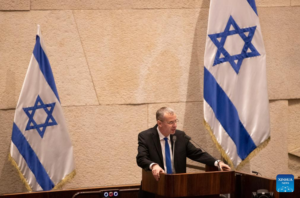 Israeli Justice Minister Yariv Levin speaks in the Knesset, the Israeli parliament, in Jerusalem, July 24, 2023. Israeli lawmakers passed on Monday a key bill of Prime Minister Benjamin Netanyahu's contentious plan to overhaul the country's judicial system. (Xinhua/Chen Junqing)