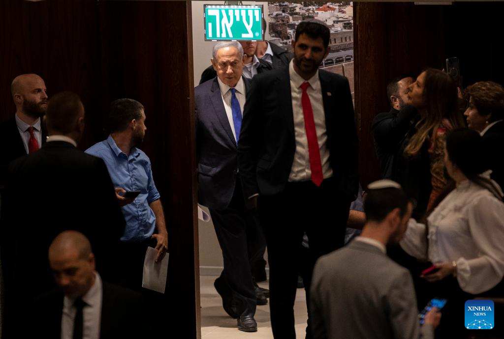 Israeli Prime Minister Benjamin Netanyahu arrives for a vote at the Israeli parliament in Jerusalem, on July 24, 2023. Israeli lawmakers passed on Monday a key bill of Prime Minister Benjamin Netanyahu's contentious plan to overhaul the country's judicial system. (Xinhua/Chen Junqing)