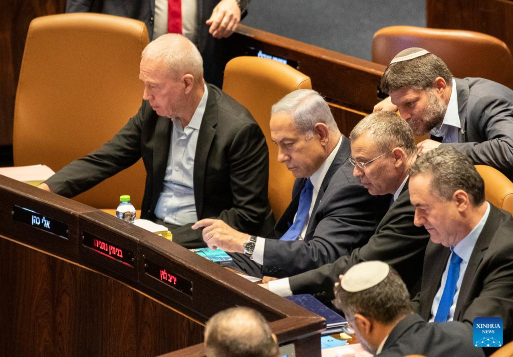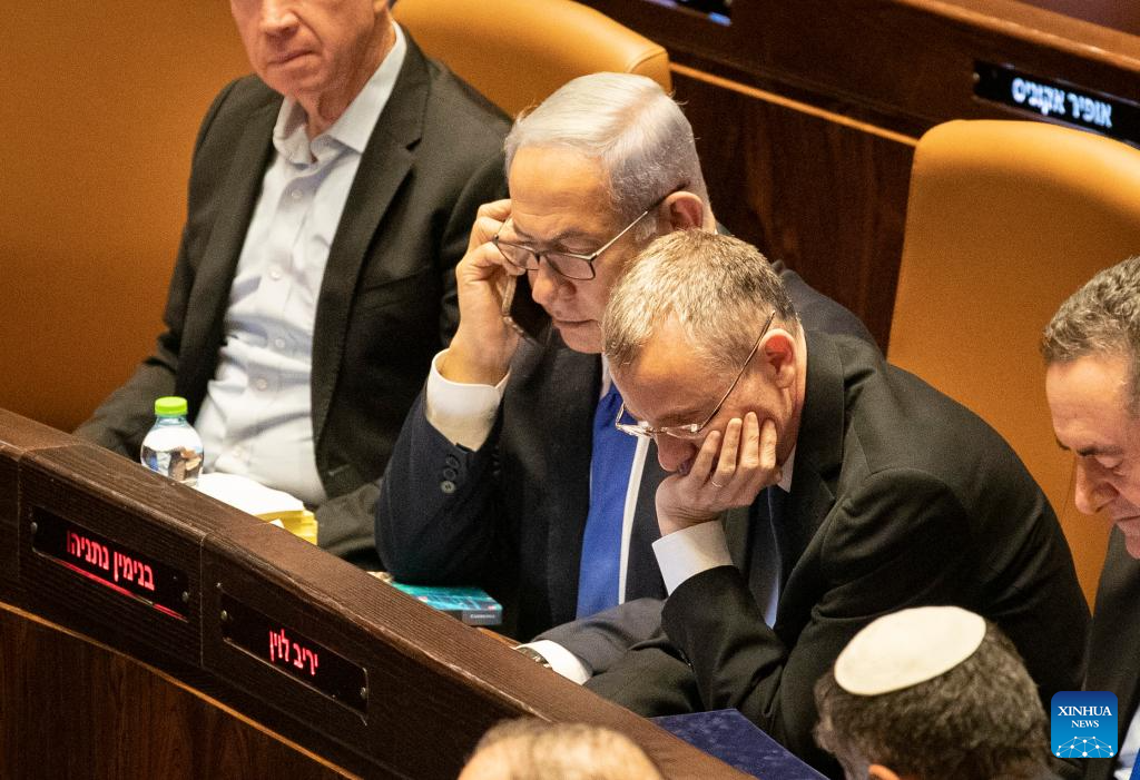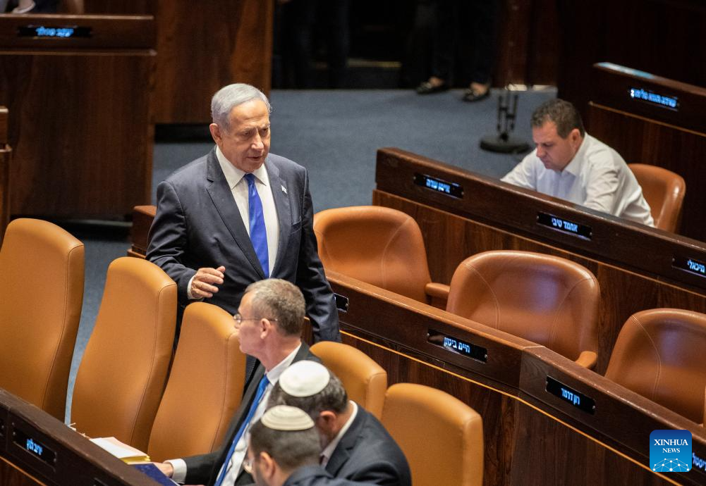 Israeli Prime Minister Benjamin Netanyahu (2nd L) attends a vote at the Israeli parliament in Jerusalem, on July 24, 2023. Israeli lawmakers passed on Monday a key bill of Prime Minister Benjamin Netanyahu's contentious plan to overhaul the country's judicial system. (Xinhua/Chen Junqing)