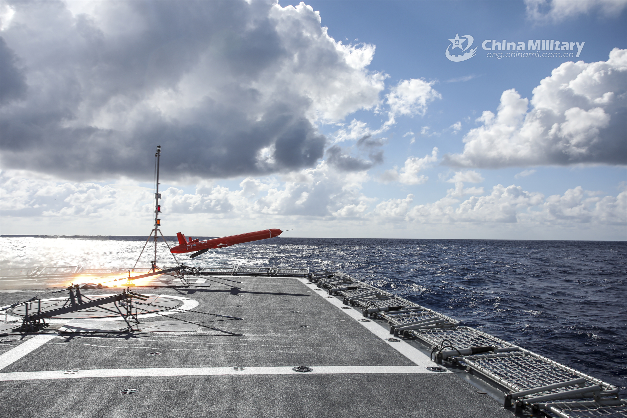 The guided-missile frigate Mianyang attached to a frigate flotilla with the navy under the PLA Southern Theater Command launches a target drone during a maritime combat training exercise in mid July, 2023. (eng.chinamil.com.cn/Photo by Ge Hanqiang and Zhang Weifeng)