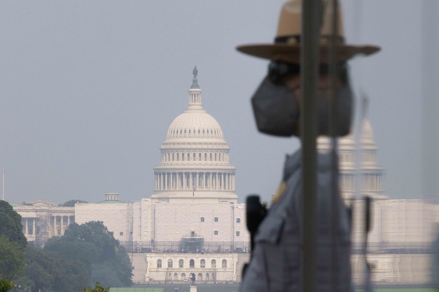 A National Park ranger wearing a face mask is seen with the U.S. Capitol building shrouded in haze in the background, as smoke from wildfires in Canada brings unhealthy air quality to the East Coast, in Washington, D.C., the United States, on June 7, 2023. (Photo by Aaron Schwartz/Xinhua)