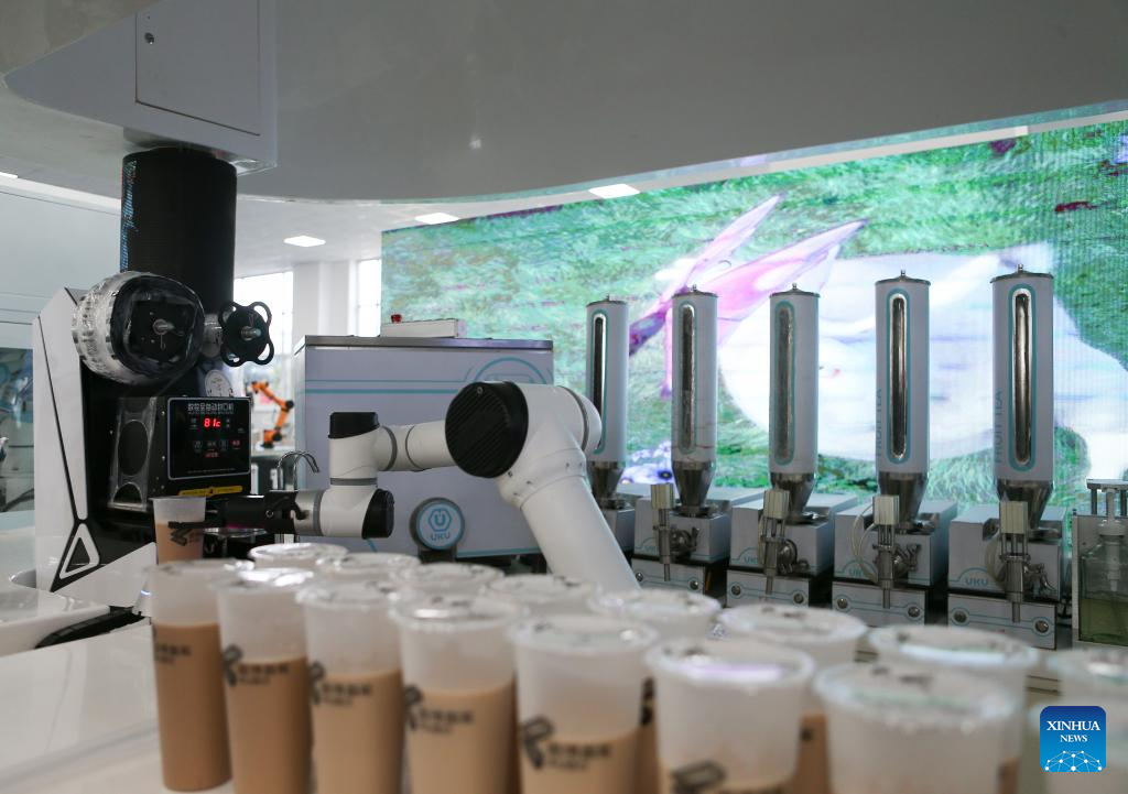 A robot makes milk tea at a robotics company in Linzi District of Zibo City, east China's Shandong Province, July 25, 2023.?(Xinhua/Zhang Haobo)