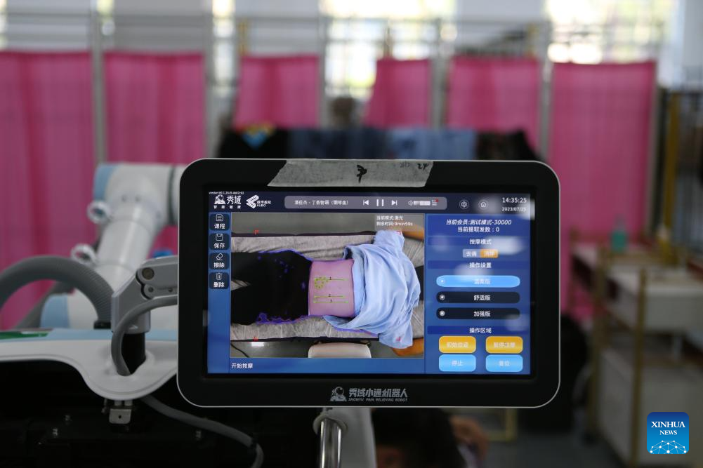 A rehabilitation robot serves a man at a robotics company in Linzi District of Zibo City, east China's Shandong Province, July 25, 2023.?(Xinhua/Zhang Haobo)