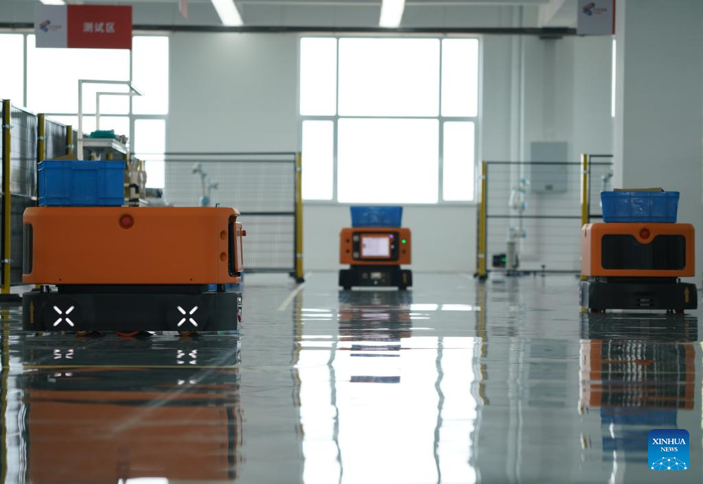 Robots deliver items at a robotics company in Linzi District of Zibo City, east China's Shandong Province, July 25, 2023. (Xinhua/Zhang Haobo)