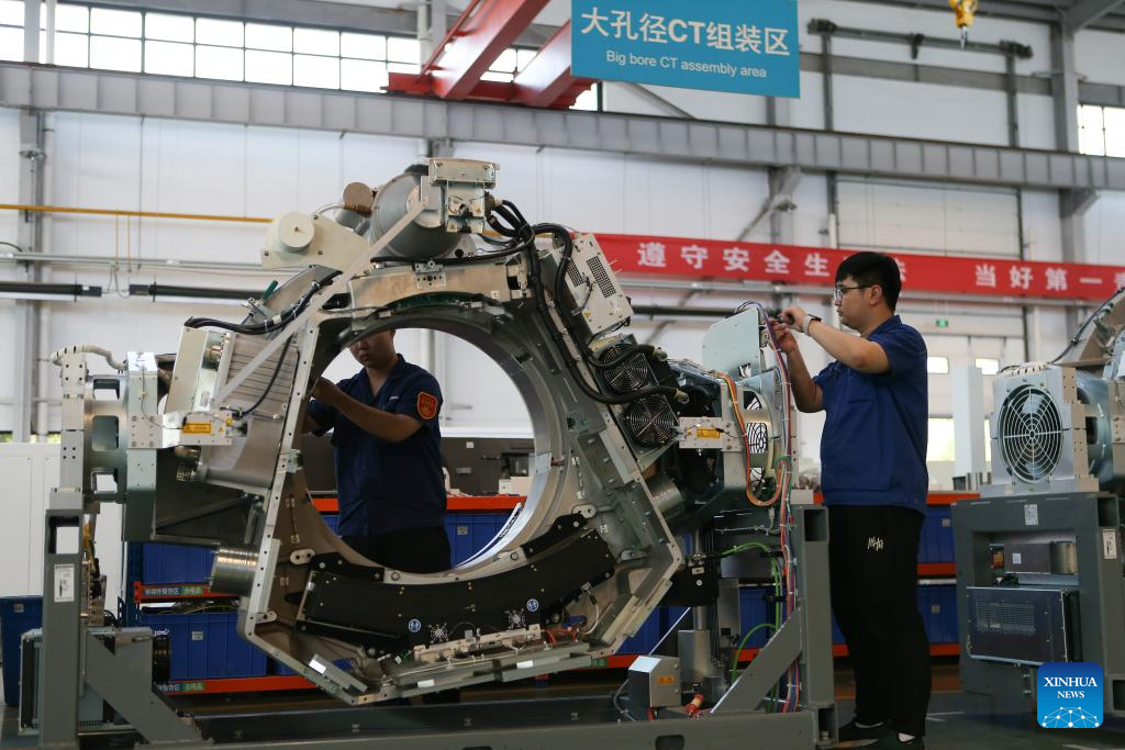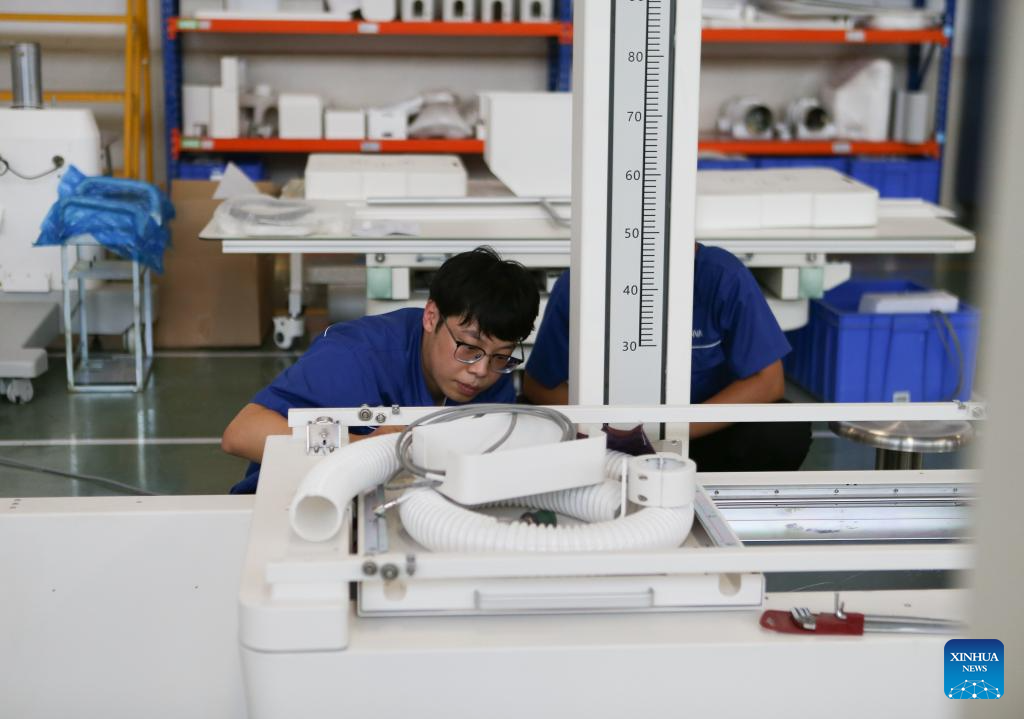 Workers assemble medical equipment in Shinva Medical Instrument Co., Ltd. in Zibo National New &Hi-tech Industrial Development Zone in Zibo City, east China's Shandong Province, July 25, 2023.?(Xinhua/Zhang Haobo)