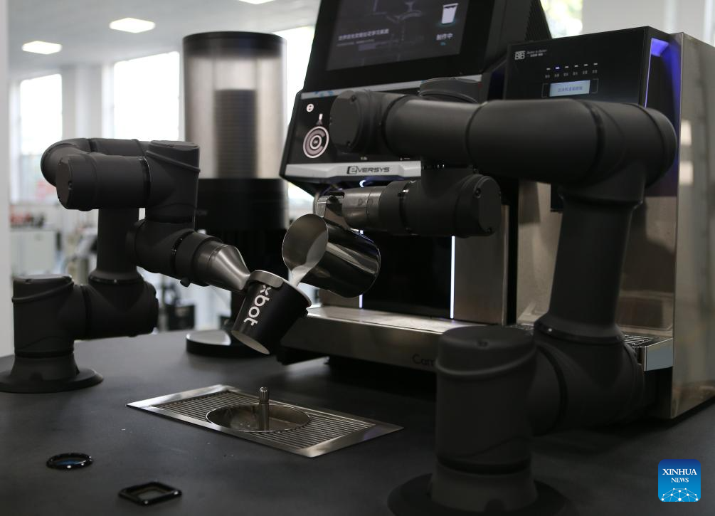 A robot makes coffee at a robotics company in Linzi District of Zibo City, east China's Shandong Province, July 25, 2023.?(Xinhua/Zhang Haobo)