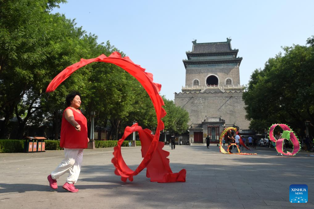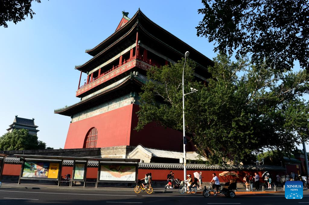 People exercise in front of the Bell Tower in Beijing, capital of China, July 18, 2023. (Xinhua/Luo Xiaoguang)