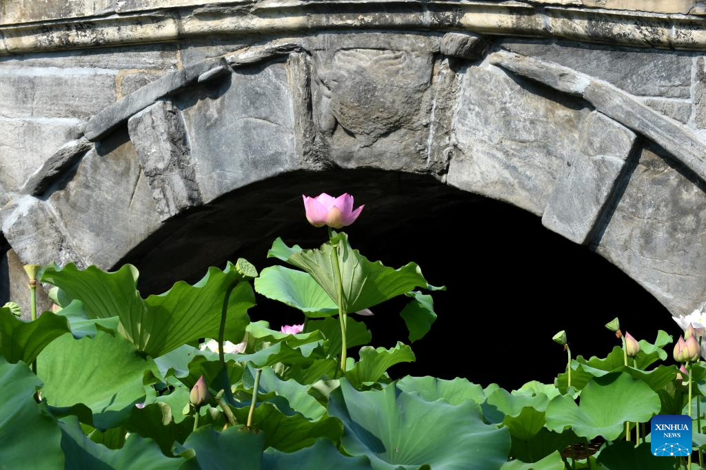 Lotus flowers are pictured beside the Wanning Bridge in Beijing, capital of China, July 18, 2023. (Xinhua/Luo Xiaoguang)