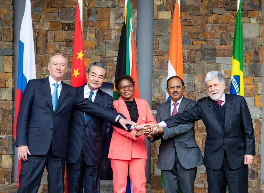 Wang Yi (2nd L), a member of the Political Bureau of the Communist Party of China (CPC) Central Committee and director of the Office of the CPC Central Commission for Foreign Affairs, poses for a group photo with Khumbudzo Ntshavheni (C), minister in the Presidency of South Africa, Celso Luiz Nunes Amorim (1st R), chief adviser of the Presidency of Brazil, Nikolai Patrushev (1st L), secretary of the Security Council of Russia, and National Security Adviser of India Ajit Doval (2nd R) at the 13th Meeting of BRICS National Security Advisers and High Representatives on National Security in Johannesburg, South Africa, July 25, 2023. (Xinhua/Zhang Yudong)
