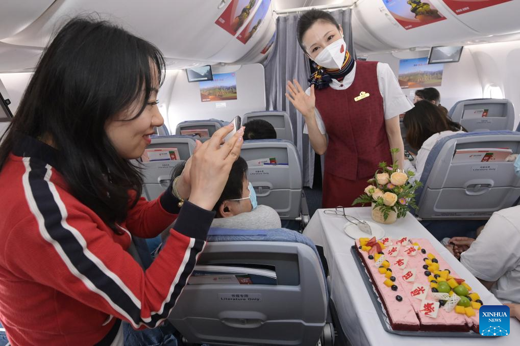 A flight attendant serves cakes for passengers aboard Air China flight No. CA9661 operating on the direct flight route from Beijing, capital of China, to Hotan of northwest China's Xinjiang Uygur Autonomous Region, July 25, 2023. Air China on Tuesday inaugurated a new direct flight service linking Beijing and Hotan of Xinjiang. (Xinhua/Li He)