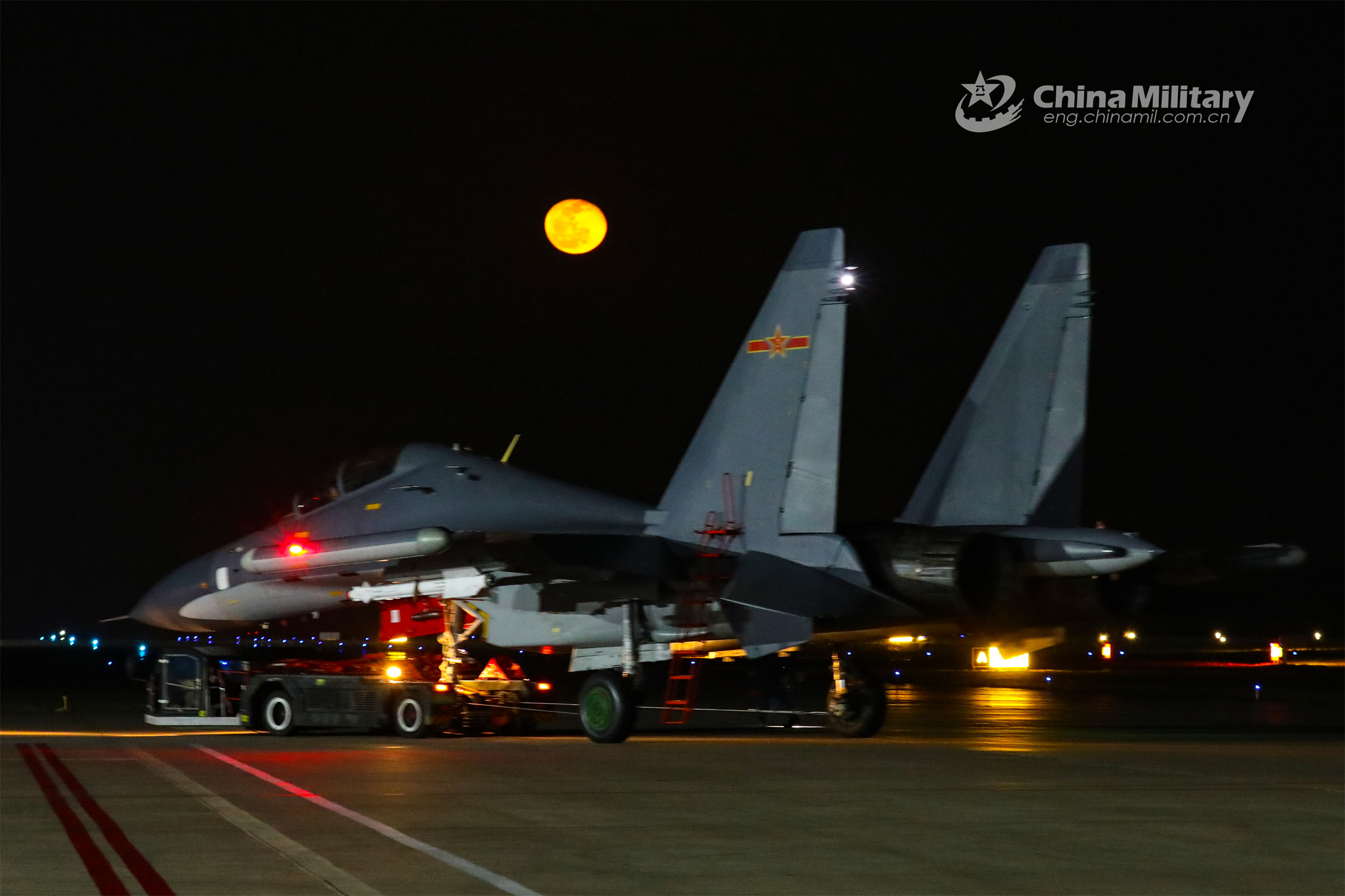 An aircraft tow tractor attached to a unit of air force under the PLA Eastern Theater Command pulls a fighter jet during a round-the-clock flight training exercise in early July, 2023. (eng.chinamil.com.cn/Photo by Li Kai)
