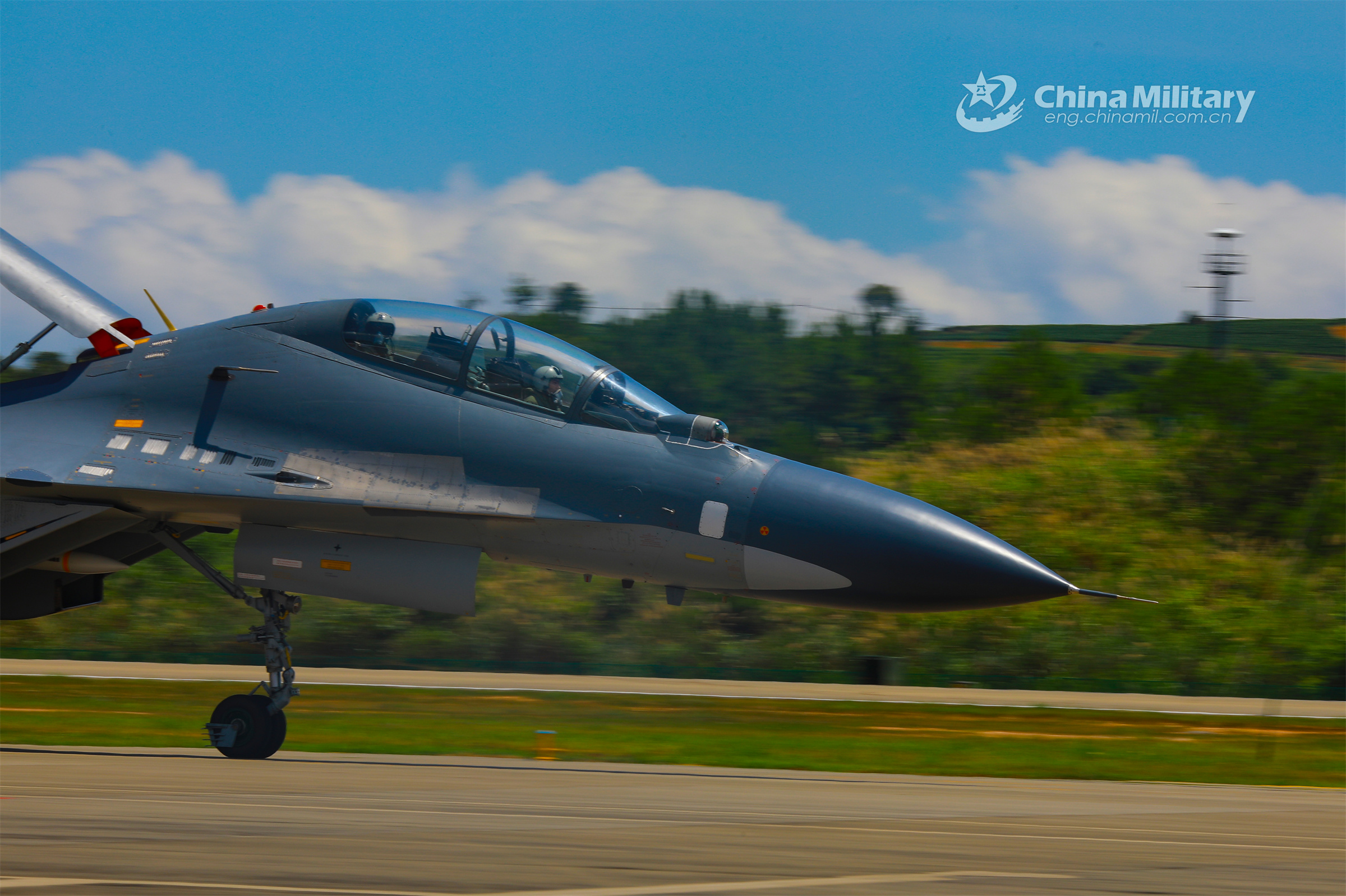 A fighter jet attached to a unit of air force under the PLA Eastern Theater Command taxis on the runway during a round-the-clock flight training exercise in early July, 2023. (eng.chinamil.com.cn/Photo by Li Kai)