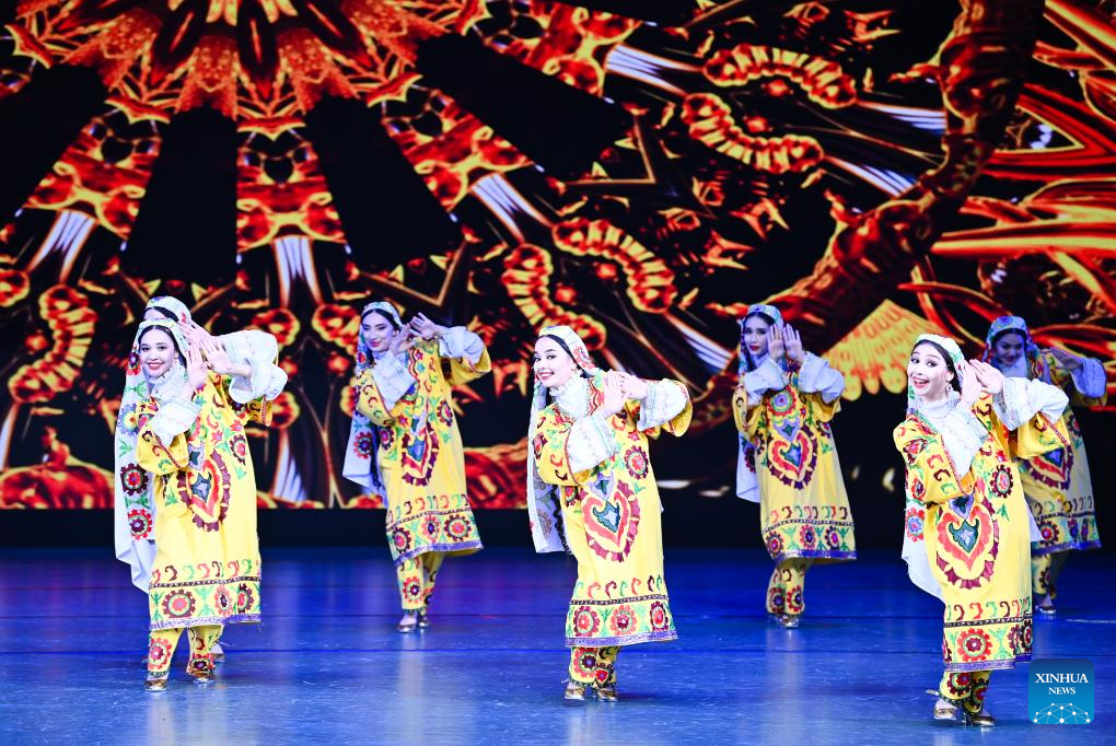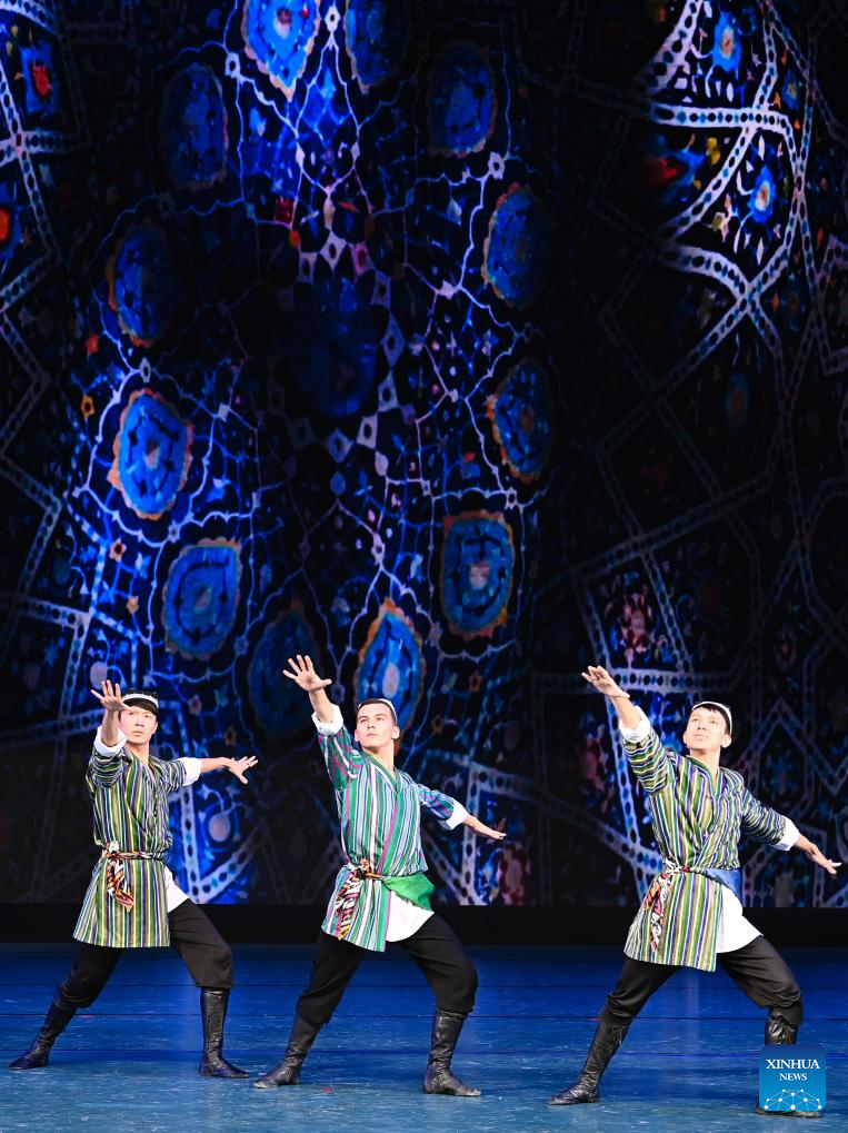 Actors of the dance troupe "Tumor" from the Uzbekistan National Grand Theatre perform during a gala titled "Our Common Home" at the 6th China Xinjiang International Dance Festival in Urumqi, northwest China's Xinjiang Uygur Autonomous Region, July 24, 2023. (Xinhua/Li Xiang)