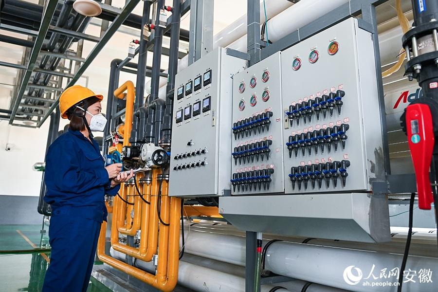 A worker checks on sewage treatment equipment at Tianying Technology Park in Jieshou, Fuyang, east China's Anhui Province. (People's Daily Online/Miao Zijian)