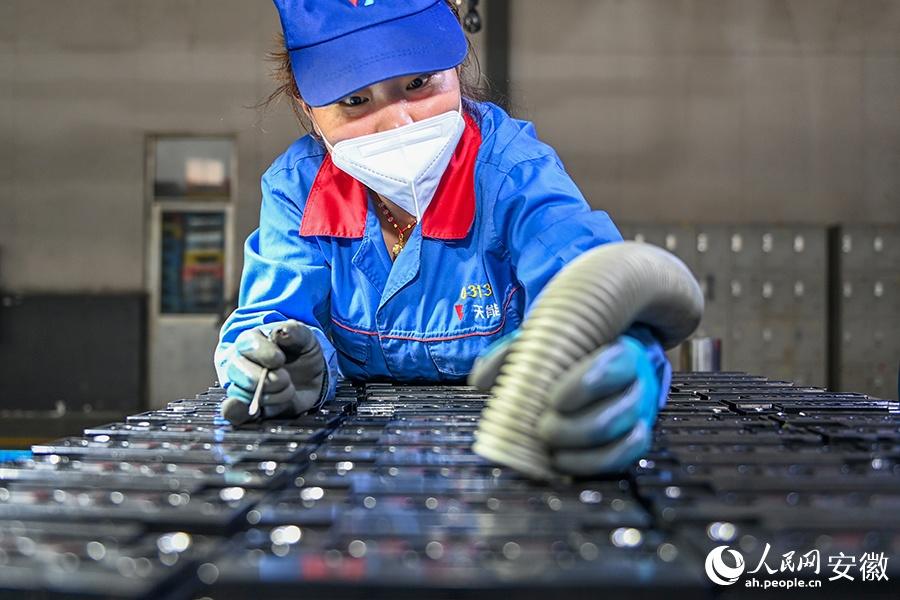 Photo shows a worker working at the assembling workshop of Tianneng Battery Group (Anhui) Co., Ltd. in Jieshou, Fuyang, east China's Anhui Province. (People's Daily Online/Miao Zijian)