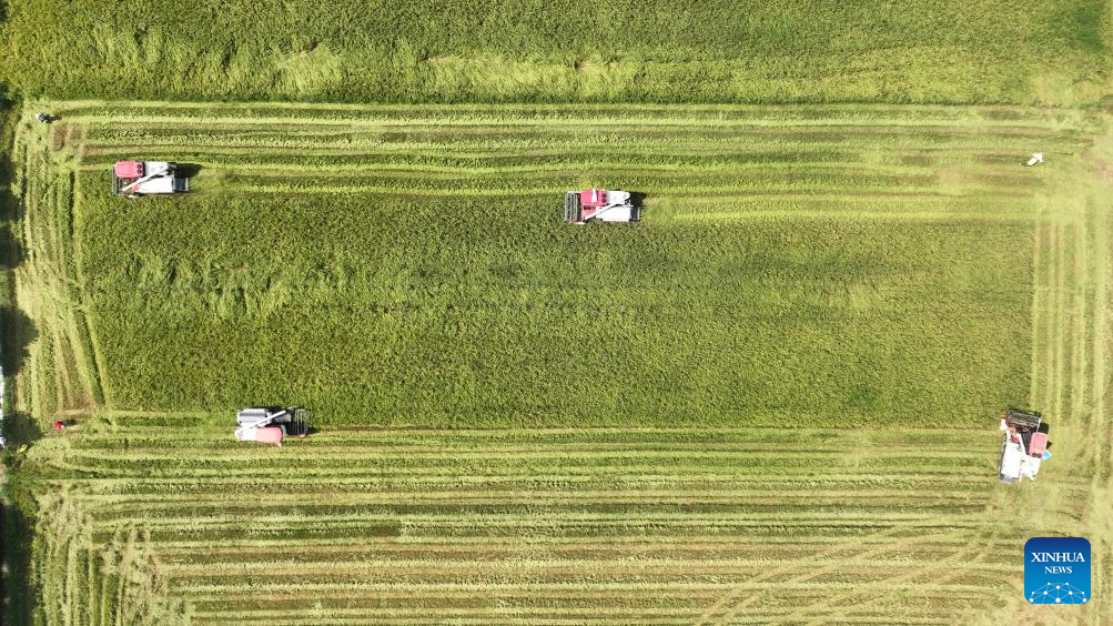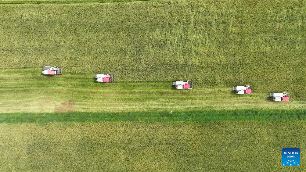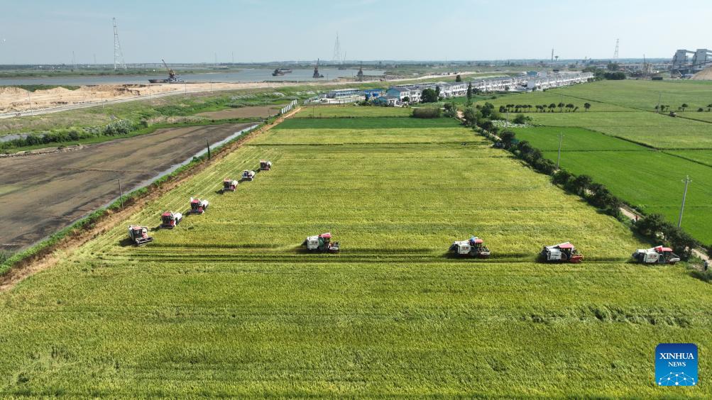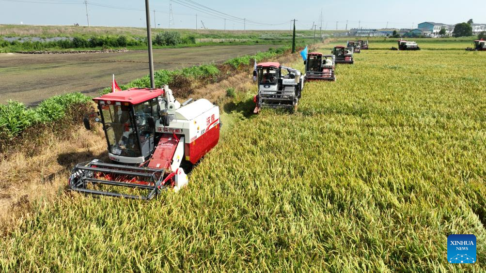 This aerial photo taken on July 24, 2023 shows harvesters working in a paddy field in Xinjian District of Nanchang City, east China's Jiangxi Province. In recent days, farmers in Nanchang have been busy in harvesting early-season rice. (Xinhua/Peng Zhaozhi)