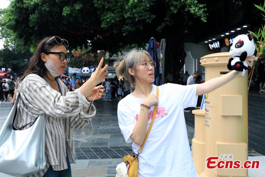 Tourists take photos with Chengdu Universiade themed decoration at the Kuanzhai Alley Historic District in Chengdu, southwest China's Sichuan Province, on July 25, 2023. (Photo: China News Service/Wang Lei)