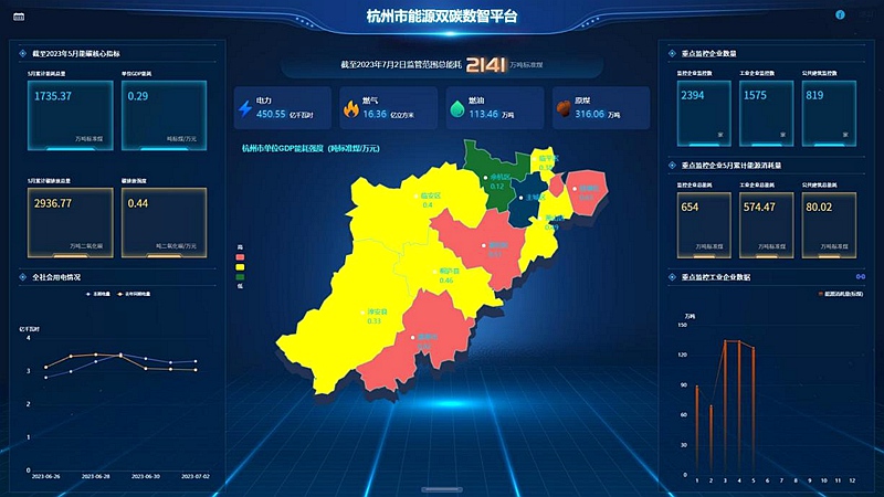 In 2021, entrusted by Hangzhou Development and Reform Commission, State Grid Hangzhou Power Supply Co., Ltd. integrated data on four types of energy - electricity, gas, oil and coal - in Hangzhou and information independently reported by key monitoring enterprises, focusing on the four core indicators including total energy consumption, total carbon emission, energy consumption intensity and carbon emission intensity, and developed the “Hangzhou dual carbon digital intelligent platform”. The platform, which began its trial operation in September 2021, provides digital and intelligent supervision over more than 2,390 industrial enterprises with annual energy consumption of 1,000 tons of standard coal and public buildings with annual power consumption of more than 1 million KWH in Hangzhou.
