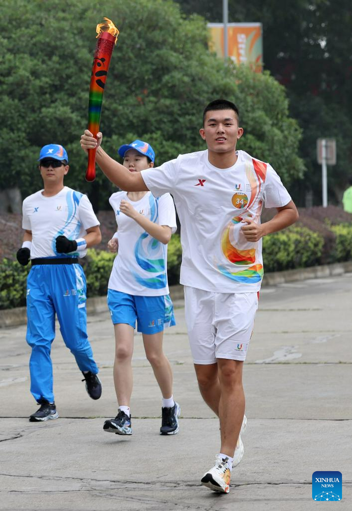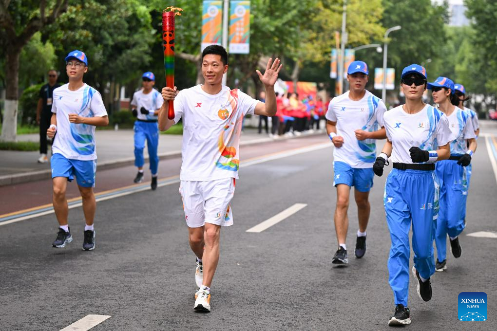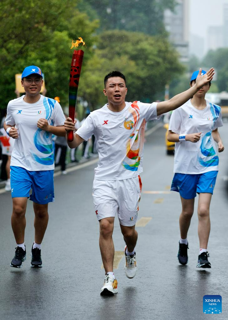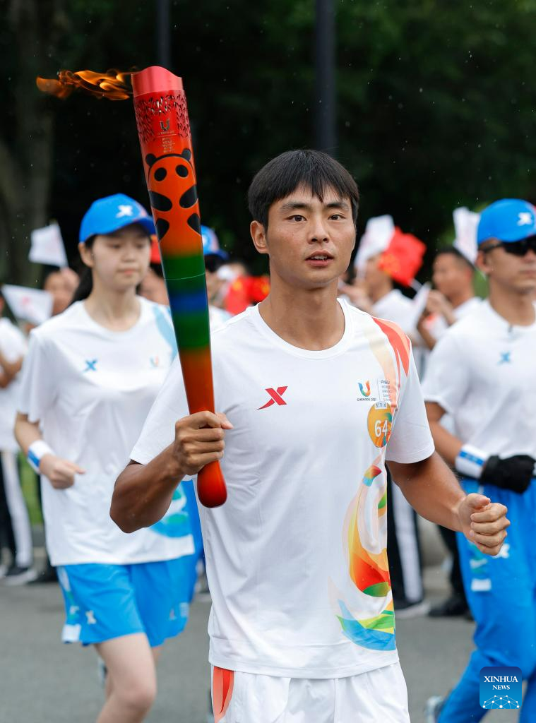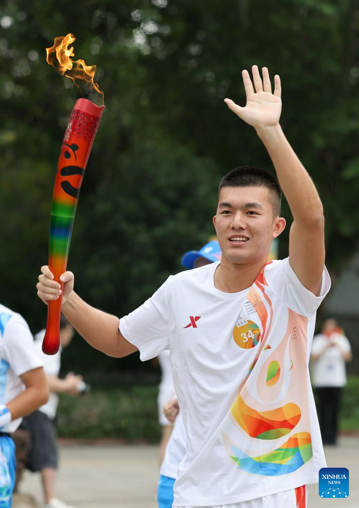 Torch bearer Wang Mingke runs with the torch during the torch relay of the 31st FISU Summer World University Gamesin Chengdu, southwest China's Sichuan Province, July 26, 2023. (Xinhua/Shen Bohan)