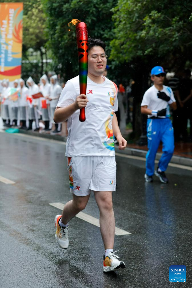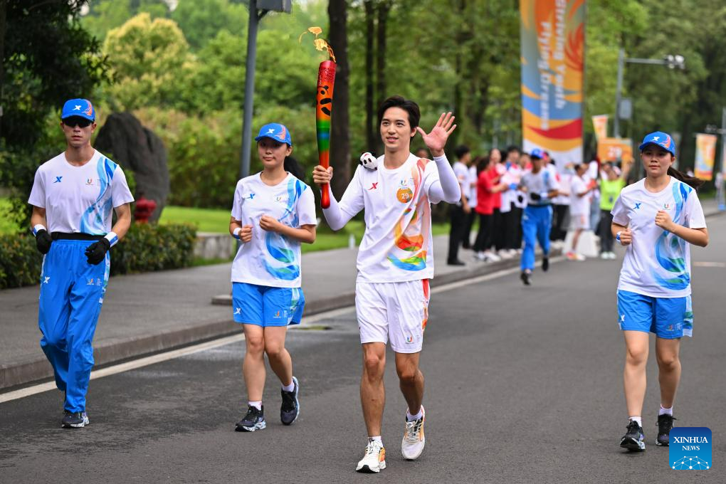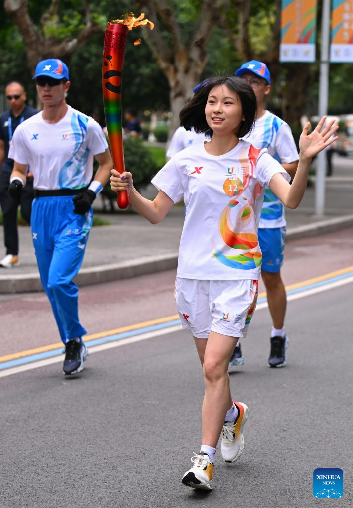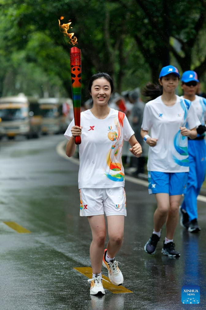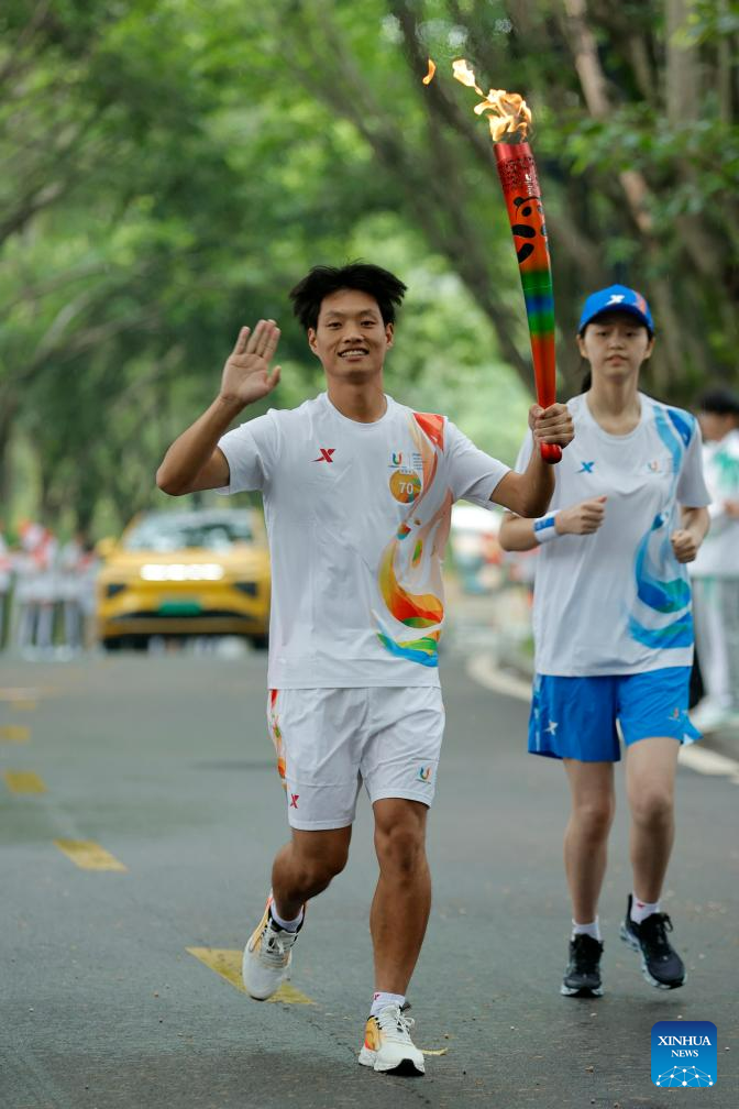 Torch bearer Wang Mingke runs with the torch during the torch relay of the 31st FISU Summer World University Gamesin Chengdu, southwest China's Sichuan Province, July 26, 2023. (Xinhua/Shen Bohan)