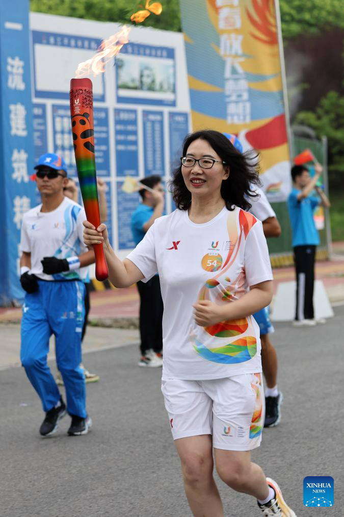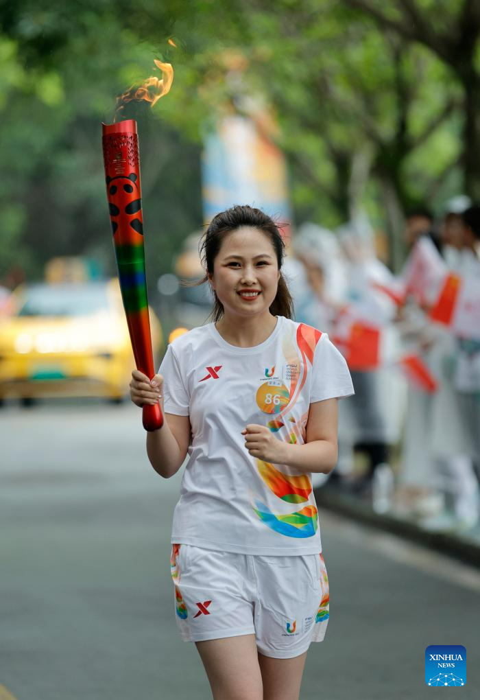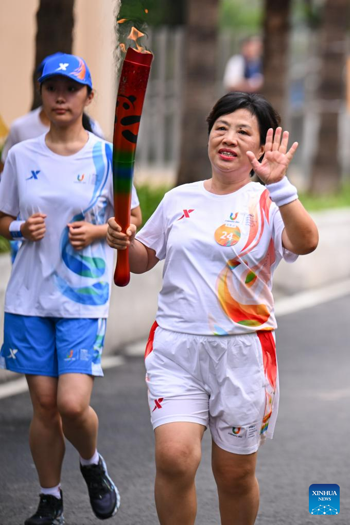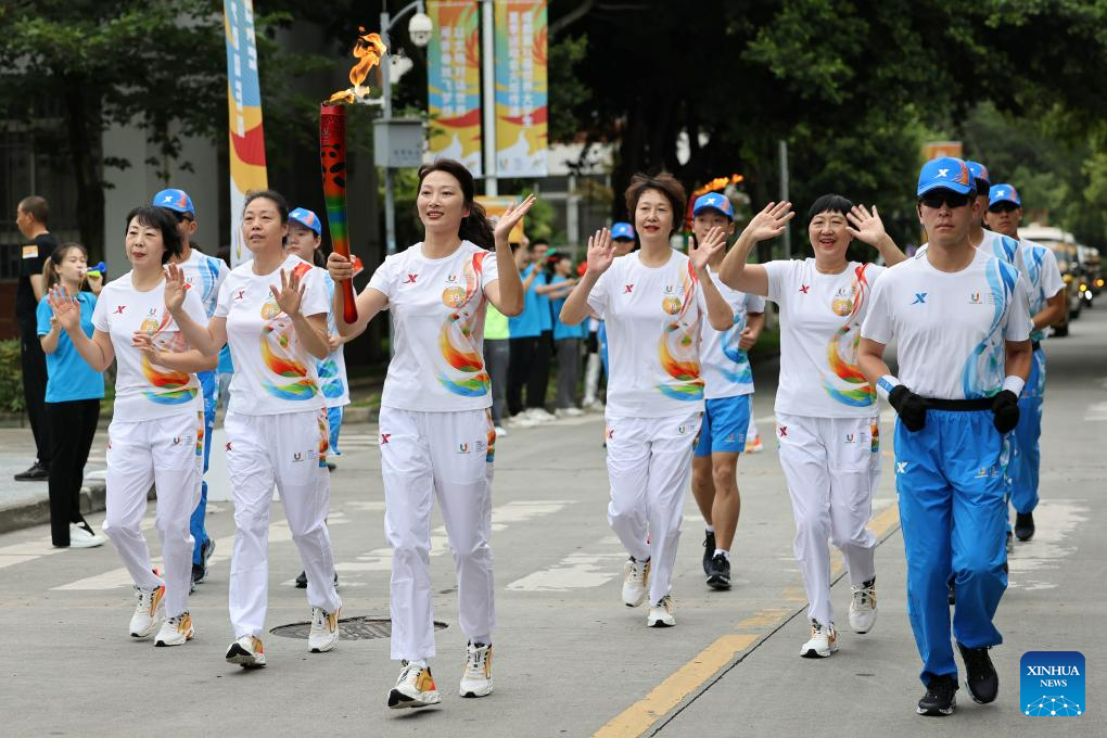 Torch bearer Wang Meijiao runs with the torch during the torch relay of the 31st FISU Summer World University Gamesin Chengdu, southwest China's Sichuan Province, July 26, 2023. (Xinhua/Shen Bohan)