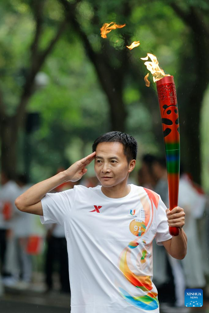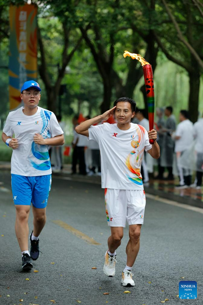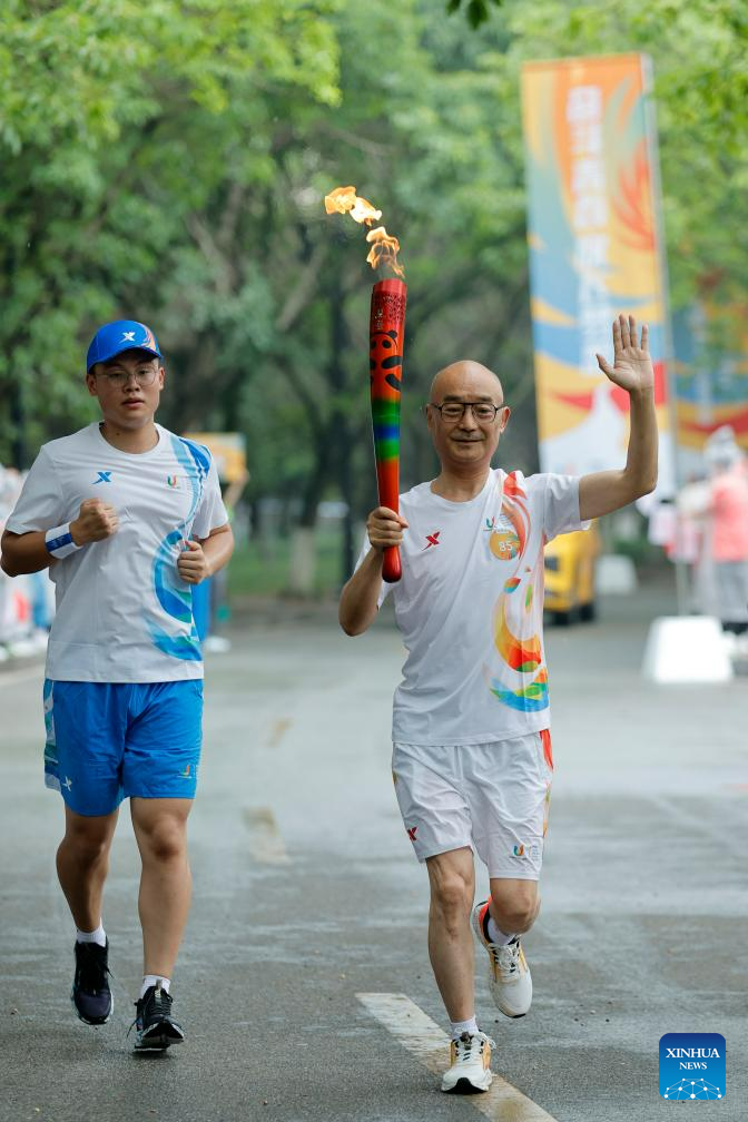 Torch bearer Xu Liaoyuan runs with the torch during the torch relay of the 31st FISU Summer World University Gamesin Chengdu, southwest China's Sichuan Province, July 26, 2023. (Xinhua/Shen Bohan)