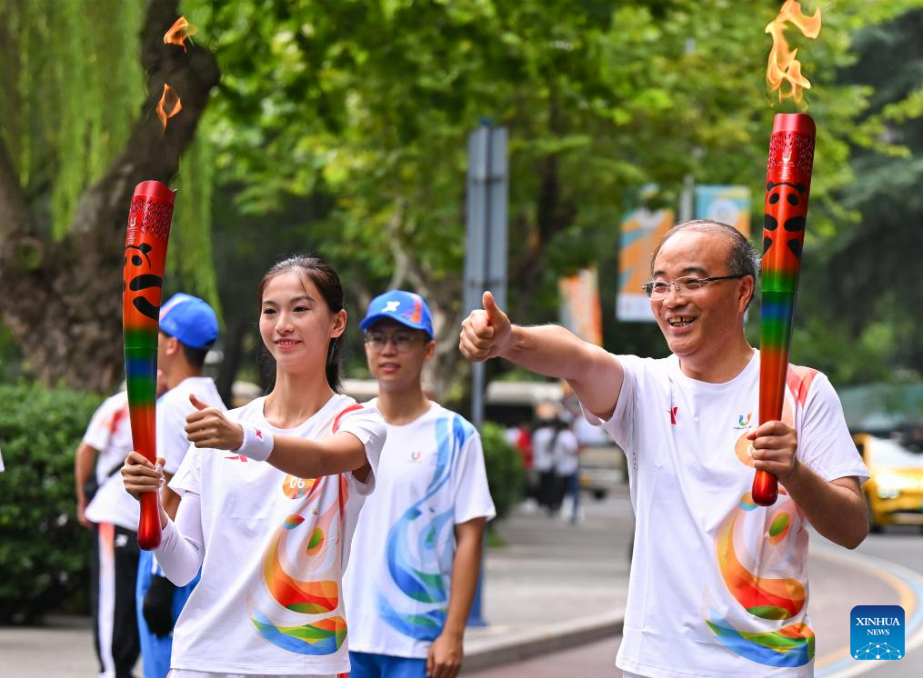 Torch bearers Liu Yuan (R) and Wang Shilun pose during the torch relay of the 31st FISU Summer World University Games in Chengdu, southwest China's Sichuan Province, July 26, 2023. (Xinhua/Chen Zeguo)