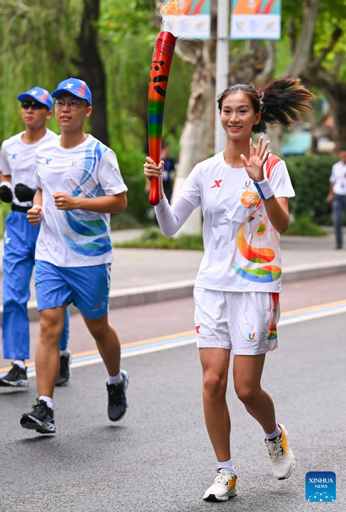Torch bearer Geng Jia runs with the torch during the torch relay of the 31st FISU Summer World University Gamesin Chengdu, southwest China's Sichuan Province, July 26, 2023. (Xinhua/Shen Bohan)
