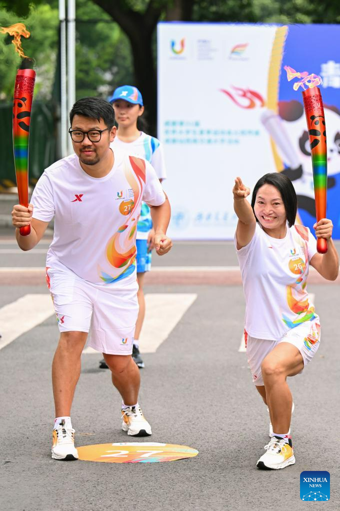 Torch bearers Wang Zhengwen (R) and Chen Dan pose during the torch relay of the 31st FISU Summer World University Games in Chengdu, southwest China's Sichuan Province, July 26, 2023. (Xinhua/Luo Xuefeng)