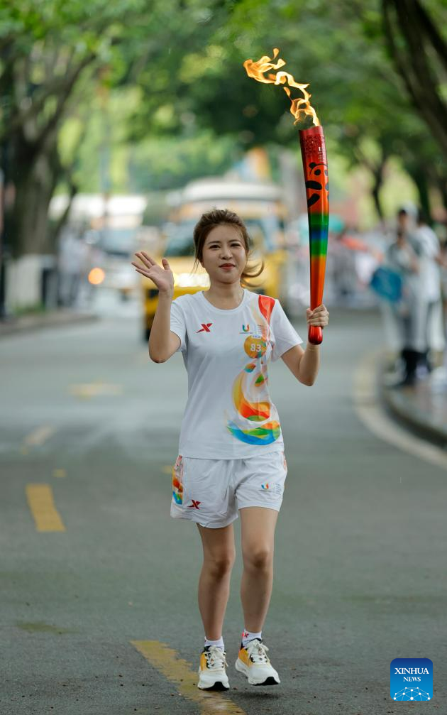 Torch bearer Lin Jiaxin runs with the torch during the torch relay of the 31st FISU Summer World University Games in Chengdu, southwest China's Sichuan Province, July 26, 2023. (Xinhua/Chen Zeguo)
