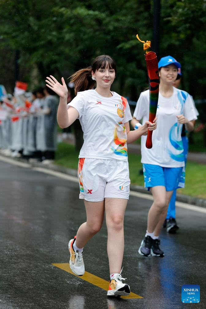 Torch bearer Liu Ran runs with the torch during the torch relay of the 31st FISU Summer World University Games in Chengdu, southwest China's Sichuan Province, July 26, 2023. (Xinhua/Luo Xuefeng)