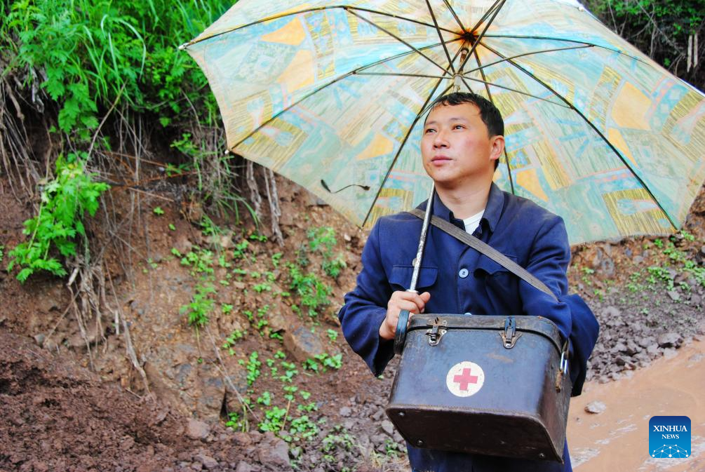 This photo taken on July 19, 2023 shows Zhu Daqing walking on a road on his way to a patient in Xinshui Village, Mazha Town of Yi-Hui-Miao Autonomous County of Weining, southwest China's Guizhou Province. (Xinhua/Yang Wenbin)