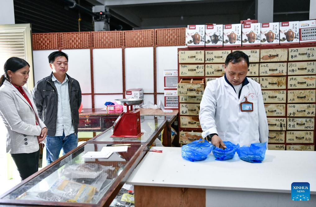 Zhu Daqing (R) prepares traditional Chinese medicine for a patient in Xinshui Village, Mazha Town of Yi-Hui-Miao Autonomous County of Weining, southwest China's Guizhou Province, July 19, 2023. (Xinhua/Yang Wenbin)