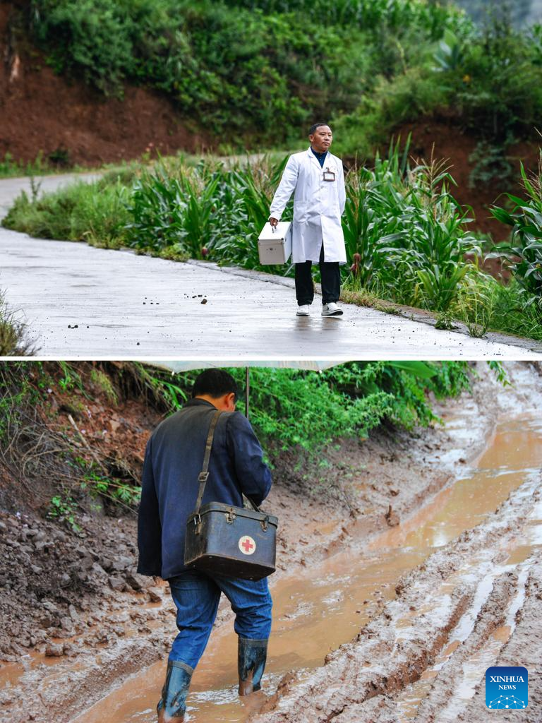 This combo photo shows Zhu Daqing walking on a flat concrete road on his way to a patient in Xinshui Village, Mazha Town of Yi-Hui-Miao Autonomous County of Weining, southwest China's Guizhou Province, July 19, 2023 (above) and Zhu Daqing walking on a muddy road on his way to a patient in Xinshui Village, Mazha Town of Yi-Hui-Miao Autonomous County of Weining, southwest China's Guizhou Province, July 4, 2012 (below). (Xinhua/Yang Wenbin)