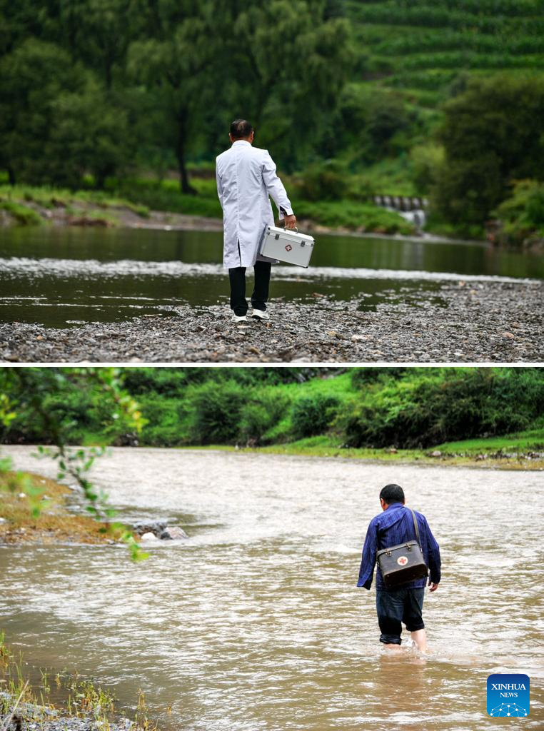 This combo photo shows Zhu Daqing walking beside a river on his way to a patient in Xinshui Village, Mazha Town of Yi-Hui-Miao Autonomous County of Weining, southwest China's Guizhou Province, July 19, 2023 (above) and Zhu Daqing wading through a river on his way to a patient in Xinshui Village, Mazha Town of Yi-Hui-Miao Autonomous County of Weining, southwest China's Guizhou Province, July 5, 2012 (below). (Xinhua/Yang Wenbin)