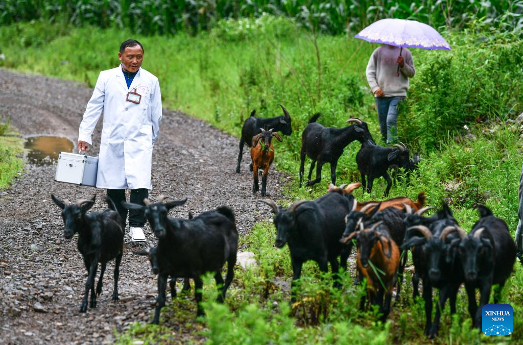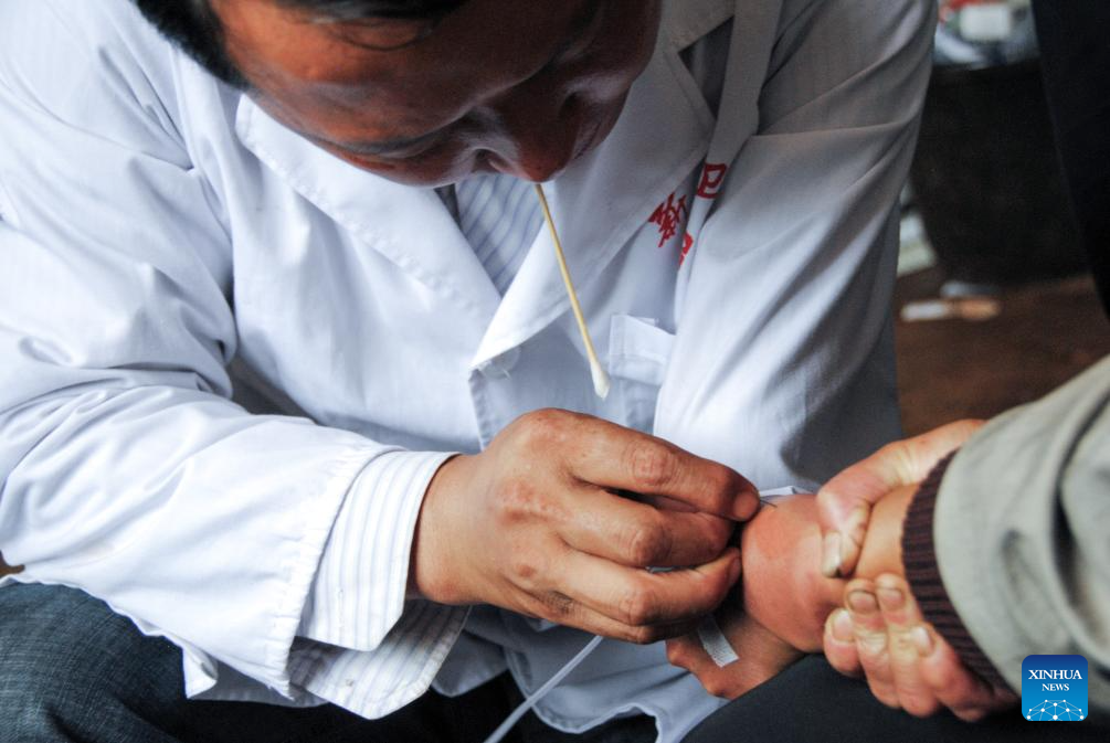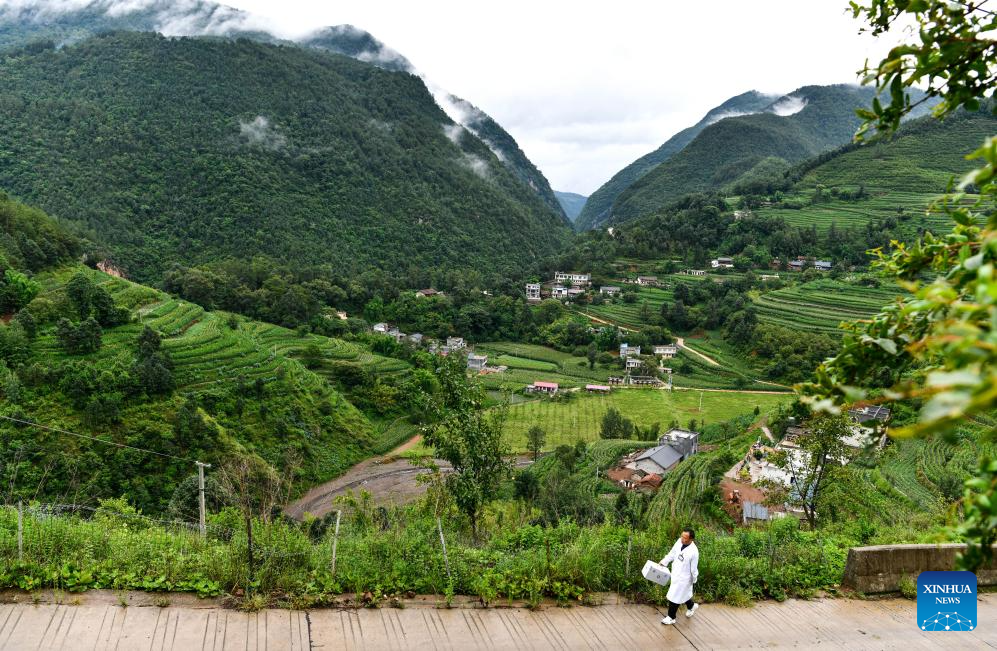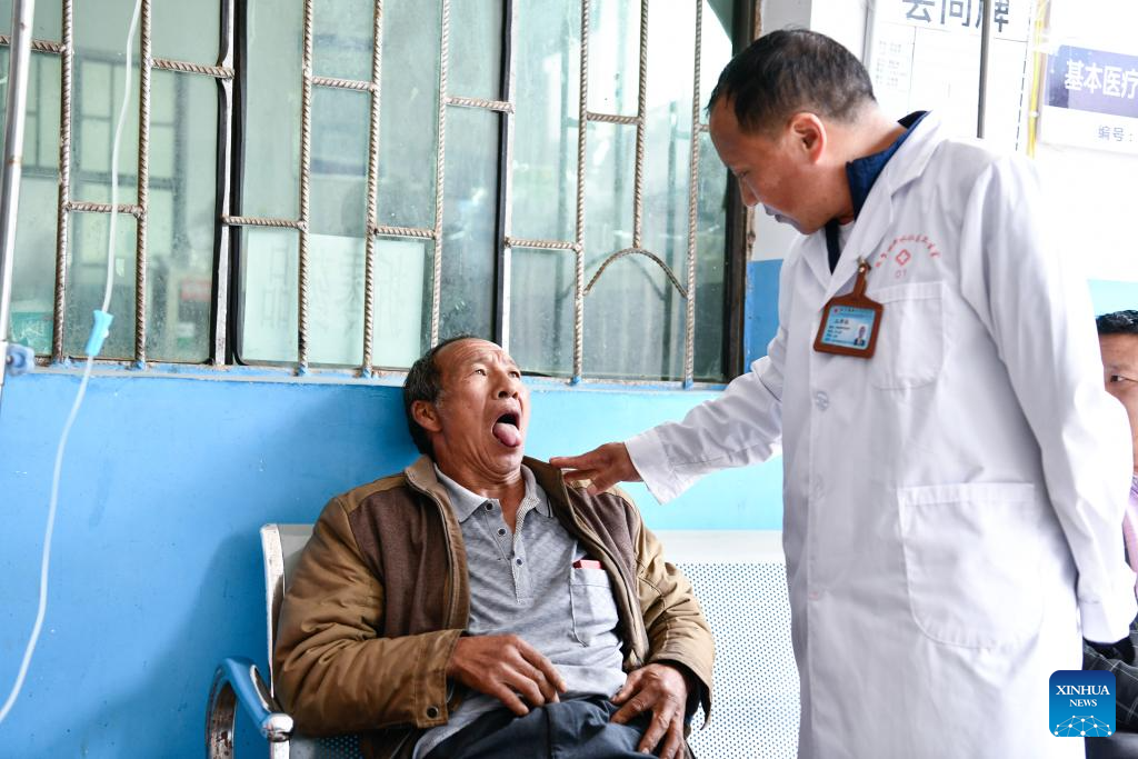 Zhu Daqing checks the condition of a patient in Xinshui Village, Mazha Town of Yi-Hui-Miao Autonomous County of Weining, southwest China's Guizhou Province, July 19, 2023. (Xinhua/Yang Wenbin)