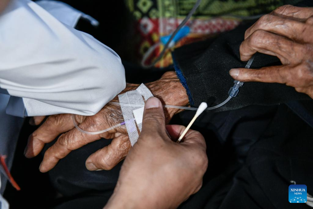 Zhu Daqing administers an intravenous drip for an elderly patient at the patient's house in Xinshui Village, Mazha Town of Yi-Hui-Miao Autonomous County of Weining, southwest China's Guizhou Province, July 19, 2023. (Xinhua/Yang Wenbin)